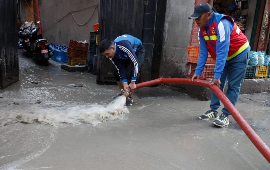 काठमाडौं २० फाल्गुन । काठमाडौंको थापाथली चोकनजिक मेलम्चीको पाइप फुटेर बगेको पानी छेउछाउका पसलभित्र छिर्दा..