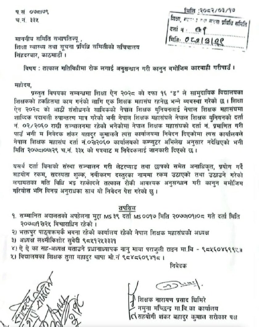 काठमाडौँ २२ असार / नेपाल शिक्षक महासङ्घको वैधानिकतामाथि गम्भीर प्रश्न उठाउँदै शिक्षक नारायणप्रसाद घिमिरे र शङ्करबहादुर कुमालले शिक्षा, स्वास्थ्य तथा सूचना प्रविधि समितिमा निवेदन दर्ता गराउँदै महासङ्घका सम्पूर्ण गतिविधिमा रोक लगाउन माग गर्दै संसदीय समितिमा उजुरी परेको छ। महासङ्घ अवैध रूपमा सञ्चालन भइरहेको र गैरकानुनी रूपमा रकम असुली गरिरहेको आरोप लगाएका छन्।
