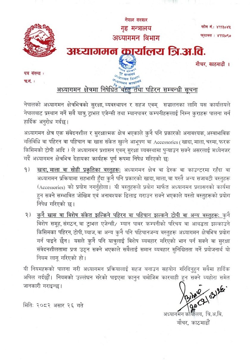 काठमाडौँ २६असार / अध्यागमन कार्यालयले एक सूचना जारी गर्दै नियम सम्पूर्ण यात्रु, ट्राभल एजेन्सी तथा म्यानपावर कम्पनीहरूका लागि लागू हुने गरि त्रिभुवन अन्तर्राष्ट्रिय विमानस्थलमा खादा, माला तथा कुनै संस्थाको पहिचान खुल्ने पोसाक र सामग्री प्रयोगमा प्रतिबन्ध लगाएको छ। अध्यागमन क्षेत्र संवेदनशील र सुरक्षात्मक हुने भएकाले यस्ता सामग्री प्रयोगमा रोक लगाइएको जनाएको हो ।