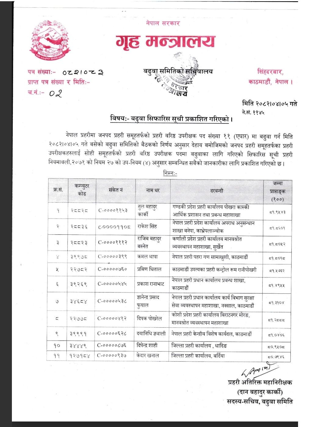 एसपीबाट तुलबहादुर कार्की, राकेश सिंह, कमल थापा, दयानिधी ज्ञवाली, दीपक पोखरेल, प्रविण धिताल, राजीब बस्नेत, दीपेन्द्र शाही, प्रकाश रानाभाट, केदार खनाल र ज्ञानेन्द्रप्रसाद फुयालको एसएसपीमा बढुवा सिफारिस भएको हो।