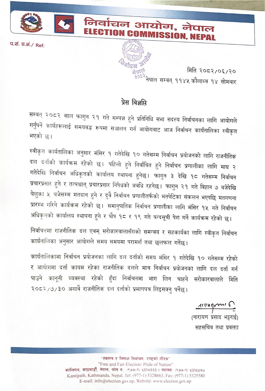 काठमाडौँ २० असोज – निर्वाचन आयोगले आगामी फागुन २१ गते घोषणा हुने भनिएको प्रतिनिधिसभा चुनावको कार्यतालिका आयोगको सोमबारको बैठकले सार्वजनिक गरेको छ ।